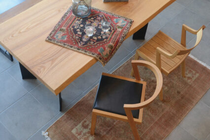 Vigoreの家具はすべて着色していない天然木を使用して製作されています。天然素材の草木染めのギャッベと天然木の自然な風合いの家具はとても相性が良く、相乗効果によってそれぞれの魅力を最大限引き出してくれつつ、まとまりのあるコーディネートになります。