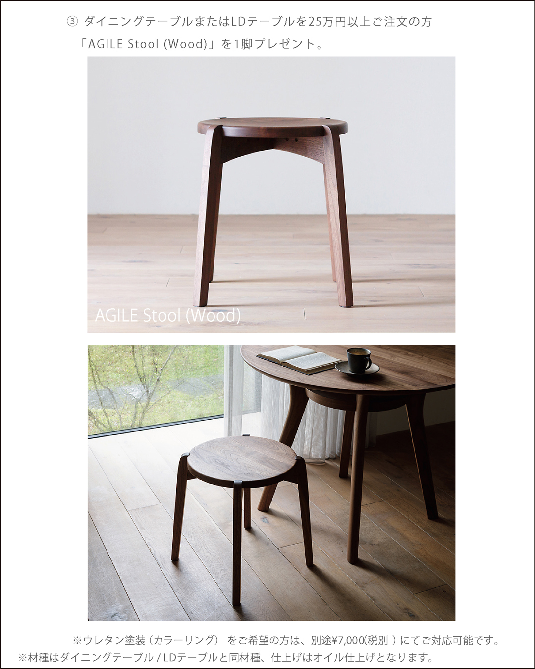 3. ダイニングテーブルを25万円以上ご注文で「AGILE Stool (wood)」を1脚プレゼント
