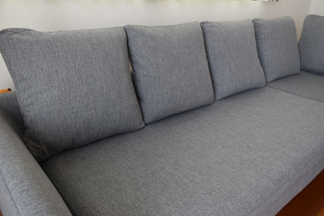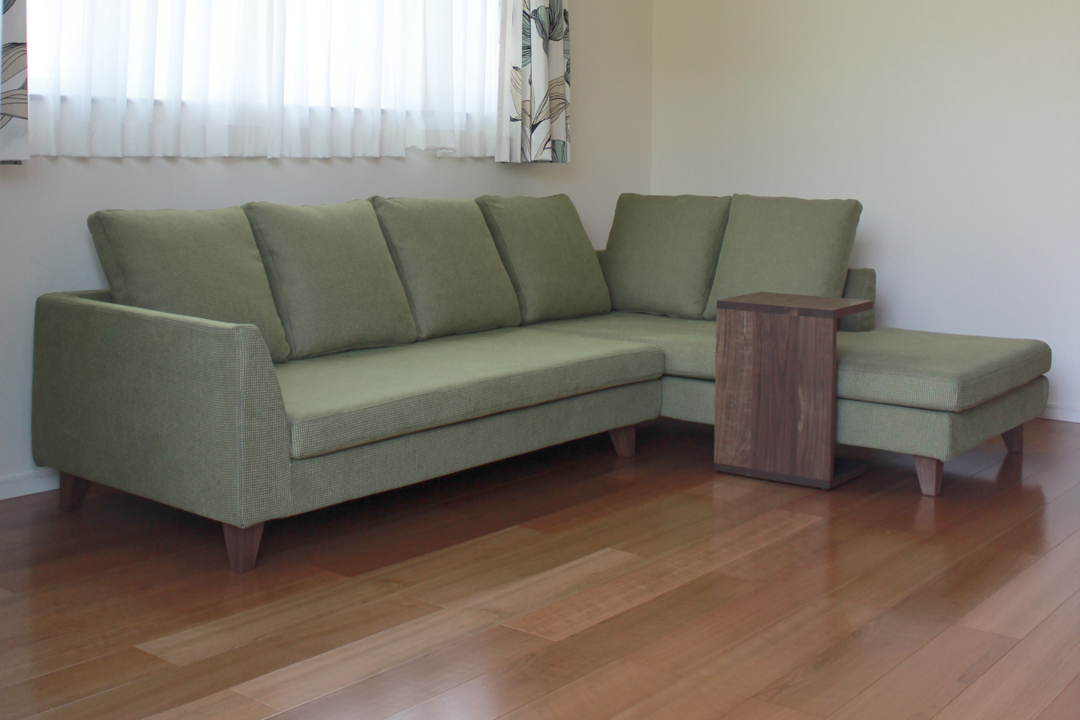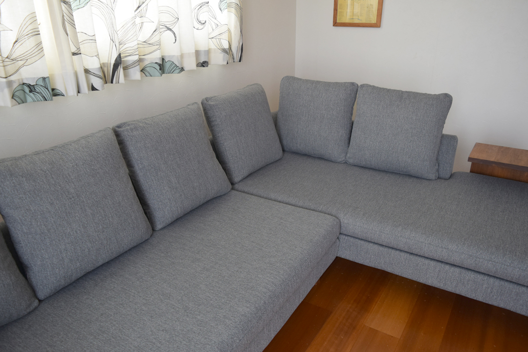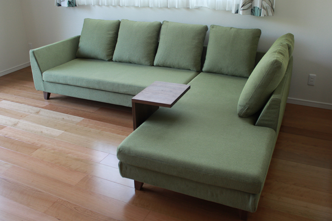 O様はご新築をされた13年前にソファをご購入いただいており、当初は千鳥格子の淡いグリーンのファブリックで納品させていただきました。