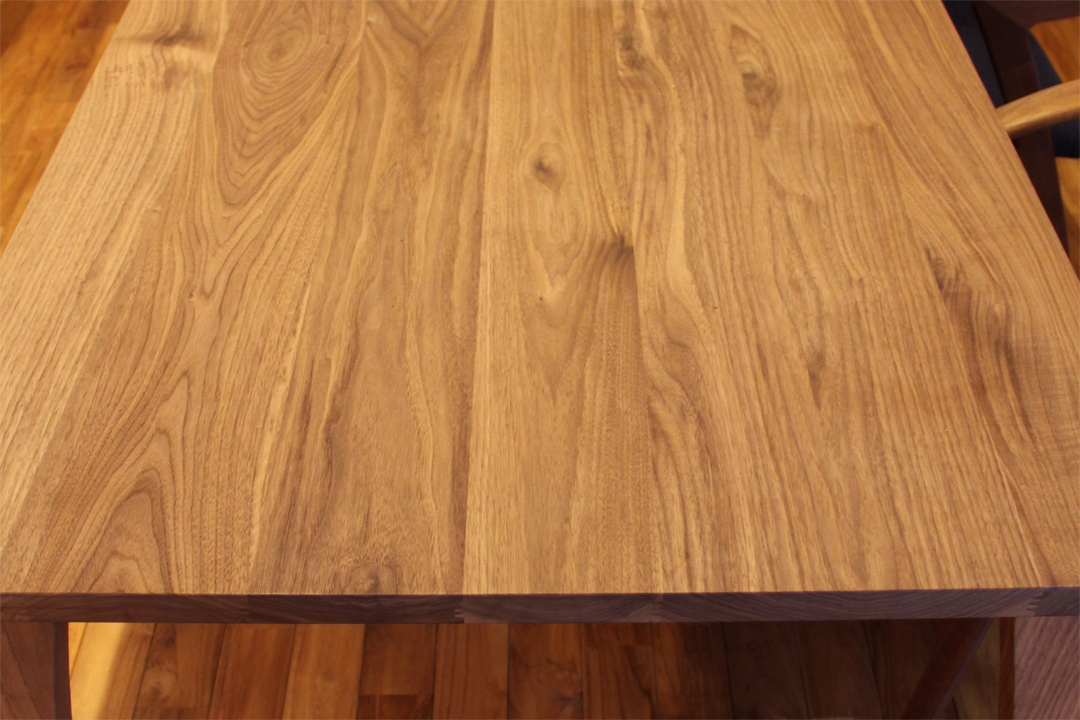 また通常のテーブルは奥行90㎝の場合、天板の剥ぎ枚数は9枚~12枚程度で製作されることが多いですが、Vigoreオリジナルのテーブルは6枚~7枚の幅広材から製作されています。