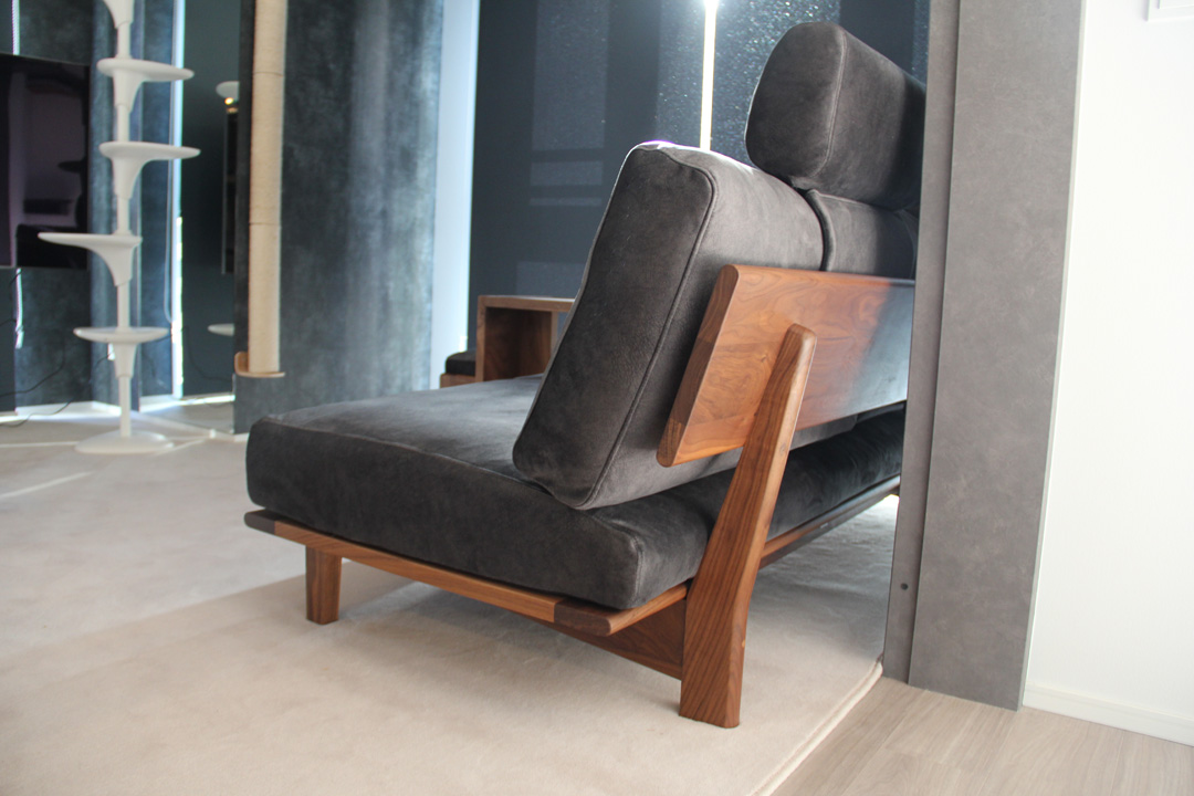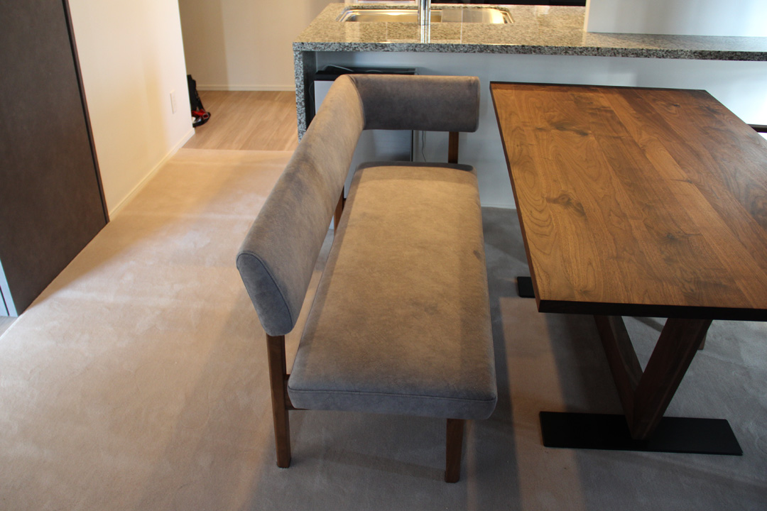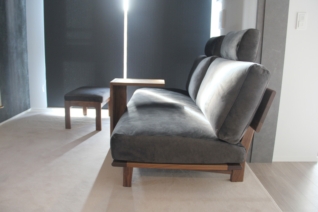 木部はウォールナット材にて高級感を出し、生地はシックなダークグレー色でお部屋の雰囲気に合わせ、とても上品なコーディネートになりました。