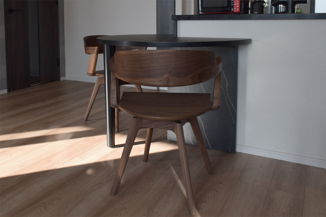 後日、ダイニングチェアもご提案させていただきイストクのスイヴェルチェアVIOLAをご夫婦ともにお気に入りいただきました。