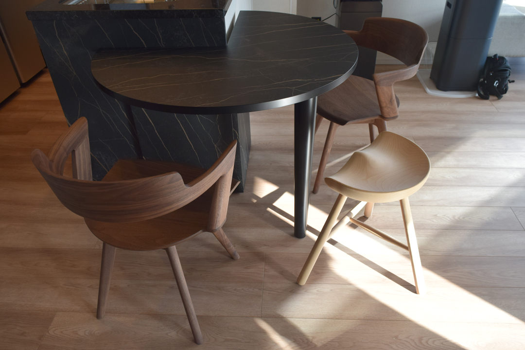 見た目の個性だけでなく、動線の確保や椅子の出し入れのしやすさといった、日々の使い勝手を第一に考えた形状です。