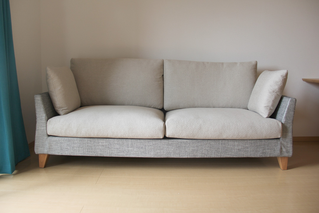 お選び頂いた生地は本体をDtype14629からライトグレー、クッション部分は凸凹としたさらりとした肌触りが特徴のDtype9748からベージュにてツートンで製作。