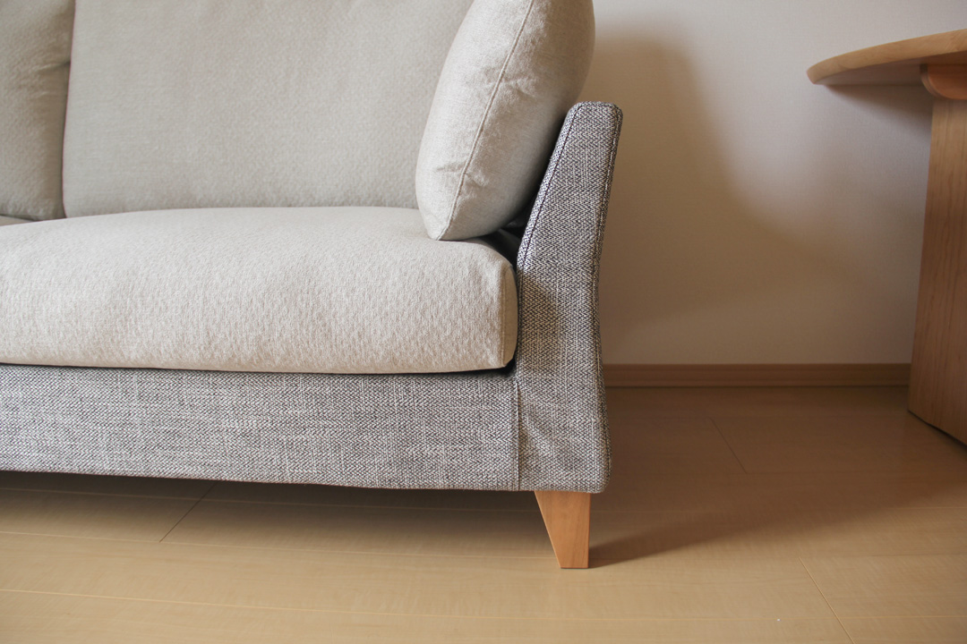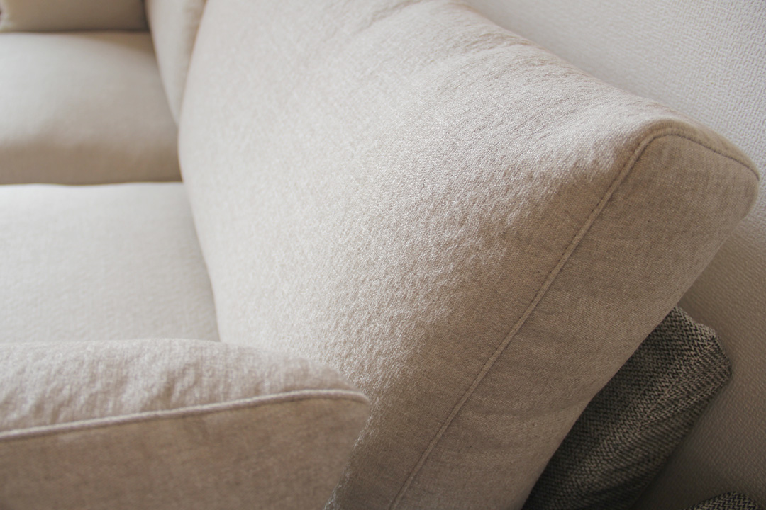 ファーストタッチはふわっとしたこの羽毛が包み込む座り心地、その後高密度ウレタンが体を支えてくれて長時間座っても疲れないソファを実現しております。