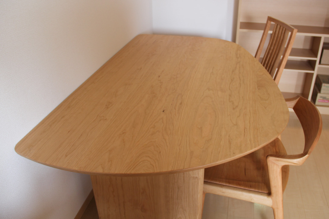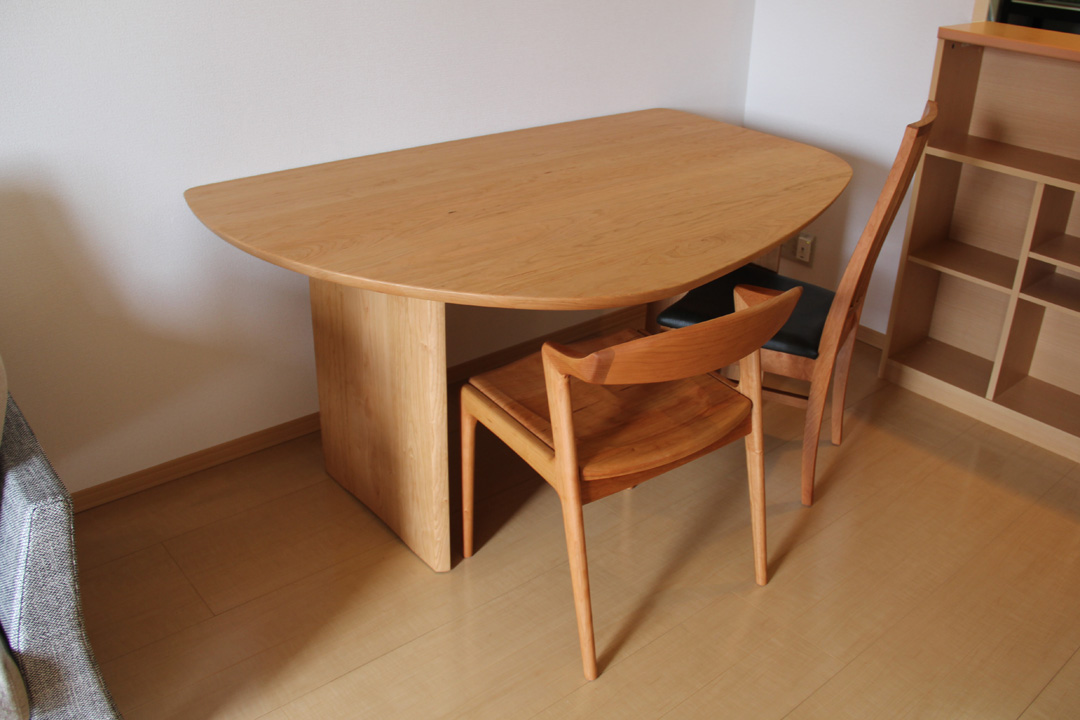 テーブルは最近とても人気の変形テーブルARCⅢを幅1600mmブラックチェリー材で製作。
