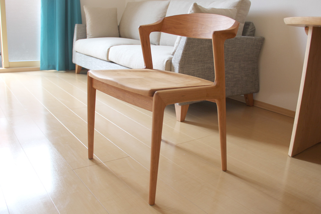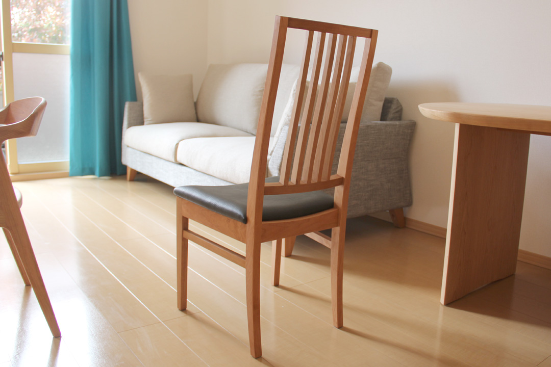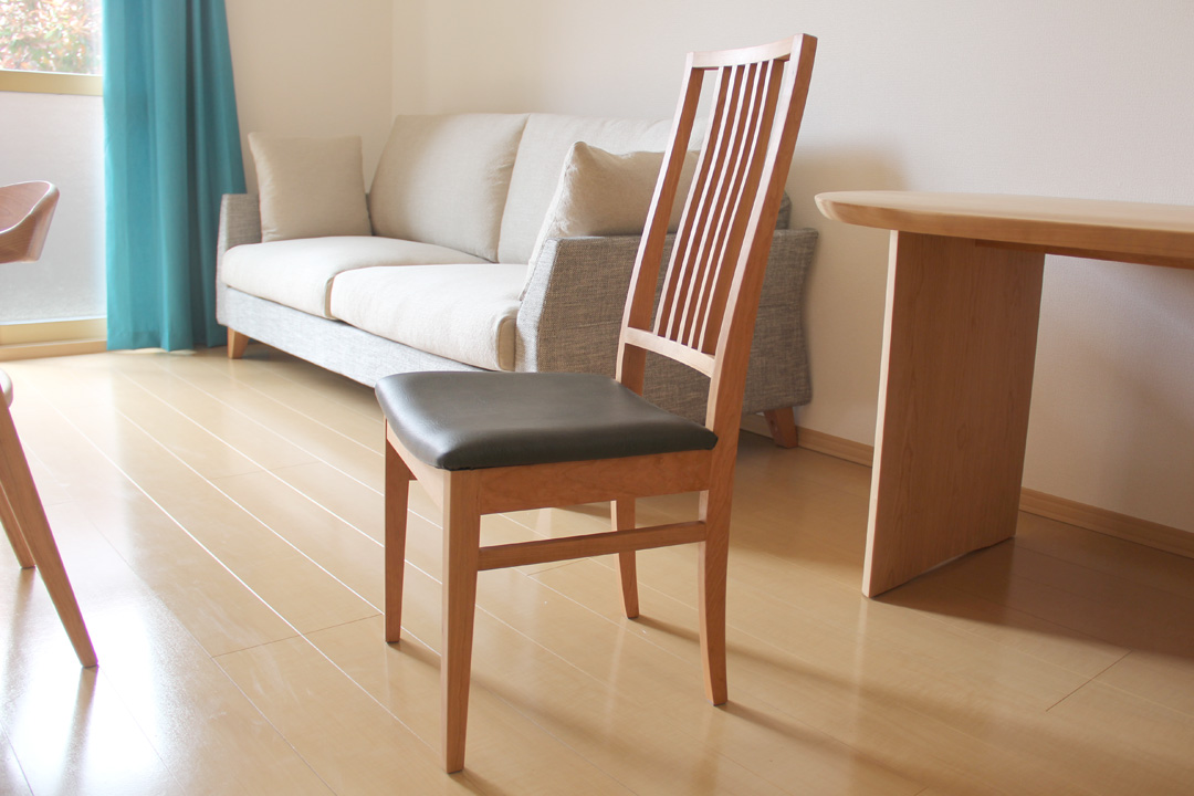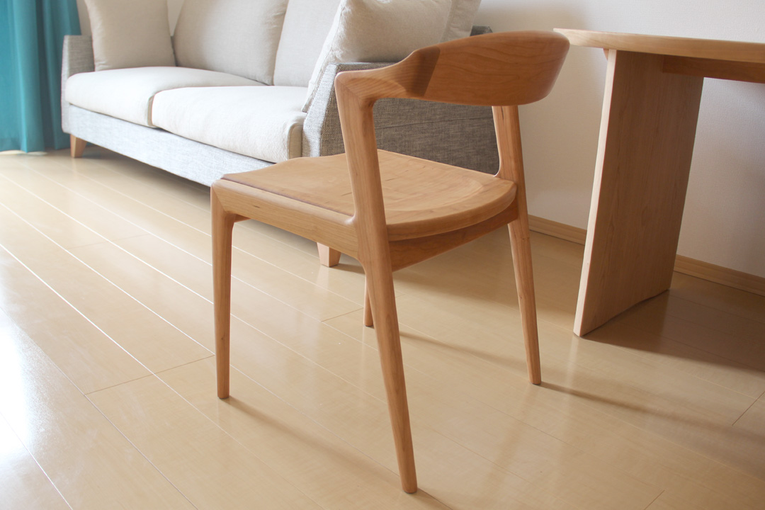 チェアは2脚お選び頂き1脚はシキファニチアのユナをセミアームでブラックチェリ材板座を選択。