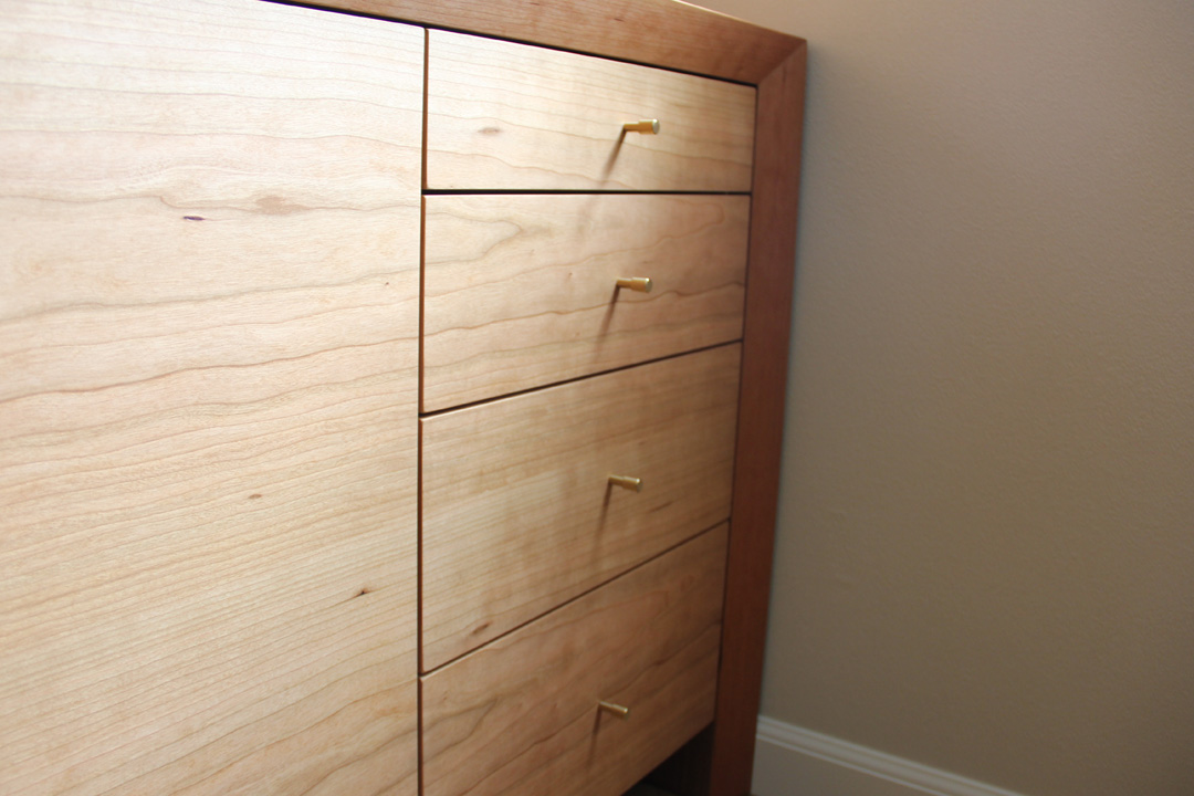 チェスト&ドアの前板は流れるような杢目の通しの突板を貼っております。