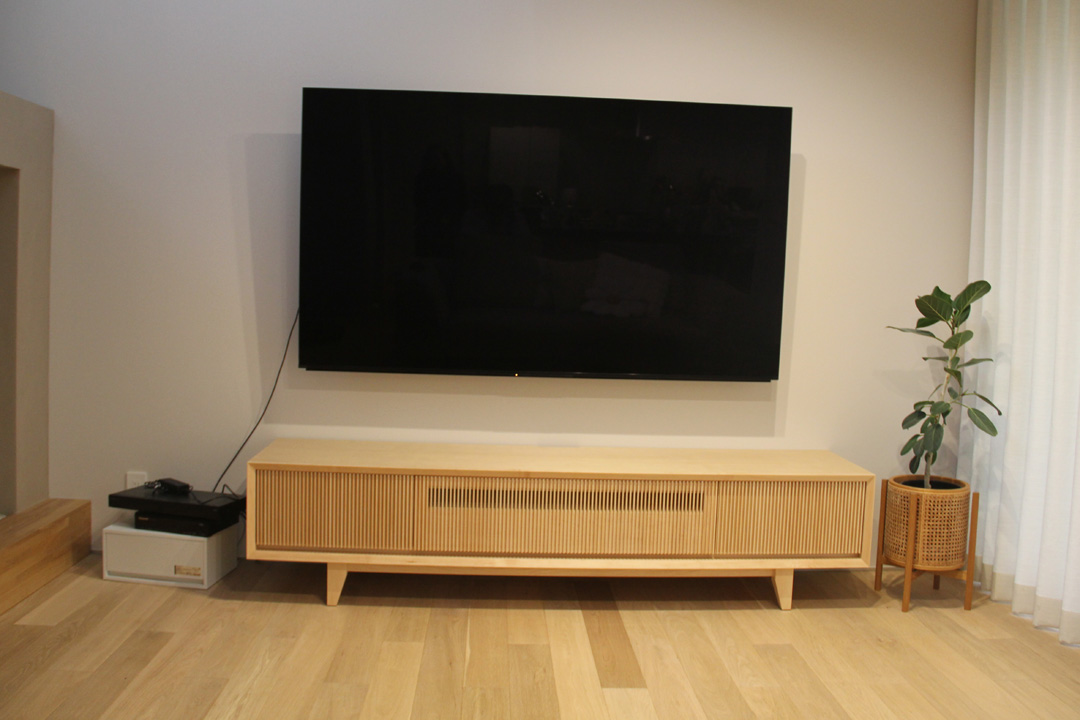 随分前からテレビボードをお探しでなかなか決め手になるものが見つからない中、弊店のオリジナルのVG-HEGHT(幅2000mm)をメープル材にてお選び頂きました。