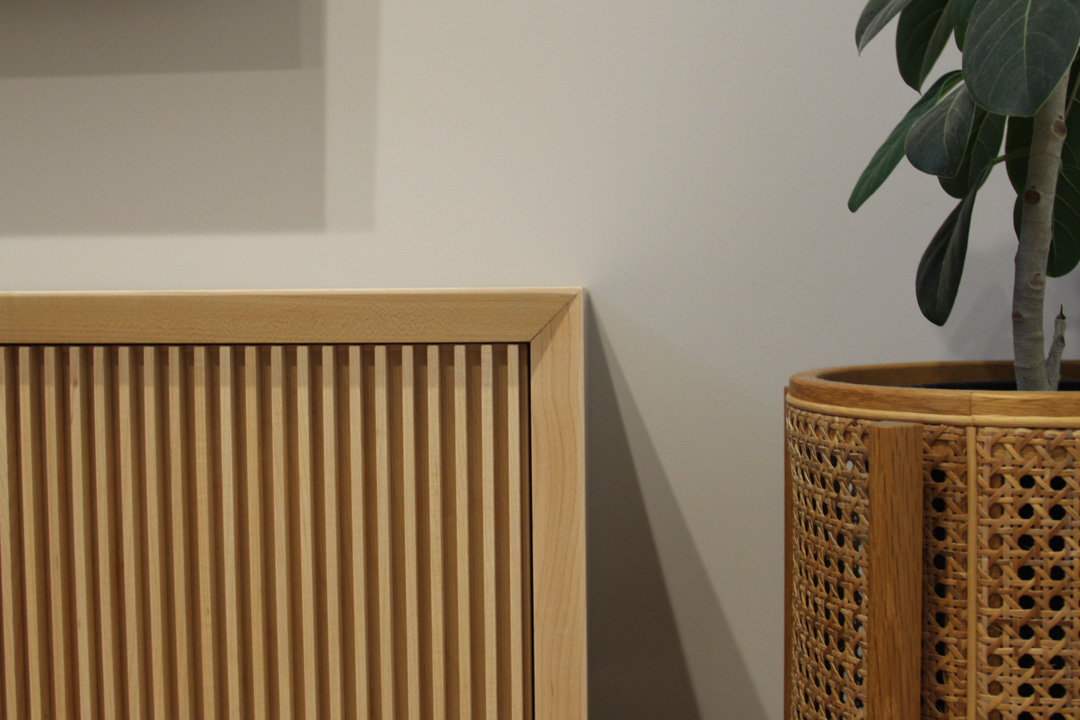 テレビボードVG-HEGHTの特徴は、なんと言っても5mmの無垢材を7mm間隔で1本1本削られた溝に職人が貼っていく丁寧かつ繊細な仕事。